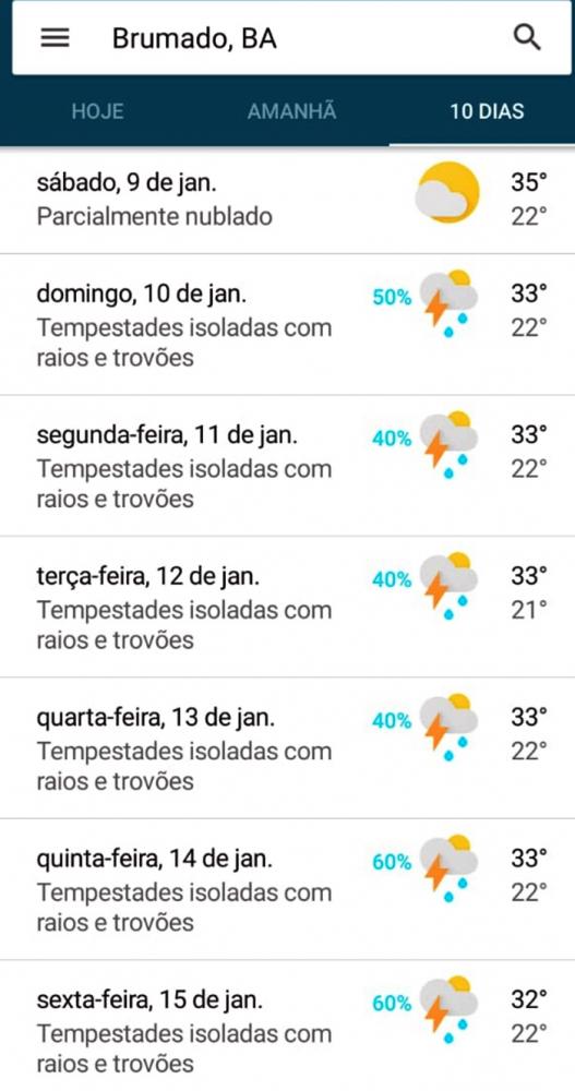 O ano de 2021 em Brumado começou com muito calor e sol “cozinhando os miolos”, como diziam os antigos, o que fez com que muita gente caprichasse no protetor solar e até no uso de sombrinhas, chapéus e outros adereços para evitar uma exposição mais agressiva aos raios ultravioletas. Essa semana os termômetros prometem que o “derretimento” será ainda maior, com temperaturas girando na casa dos 37 graus, mas, a boa notícia é que todos os institutos meteorológicos apontam que, a partir do próximo dia 10, domingo, o município receberá generosas precipitações pluviométricas que devem ir, no mínimo, até a sexta-feira (15), confira gráfico abaixo. Com isso, os brumadenses podem preparar as capas, as galochas e os guarda-chuvas por que “o cacau vai cair”. Caso o volume pluviométrico seja intenso, como é previsto para alguns dias, com cerca de 50mm, outro fator histórico que deverá se repetir é a danificação da malha viária de diversos locais da cidade, acompanhada de rompimentos de esgotos, já que o município ainda não possui o tão aguardado e necessário esgotamento sanitário, se reservando, mesmo em pleno século da tecnologia, a ter de forma amarga, somente uma rede de esgotamento pluvial, a qual está ficando cada vez mais obsoleta.
