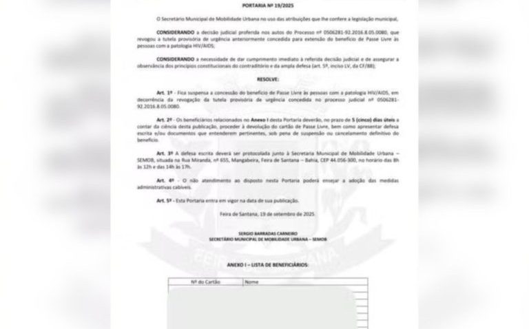 Prefeitura de Feira de Santana publica lista com mais de 600 nomes de pessoas que vivem com HIV 22 de setembro de 2025