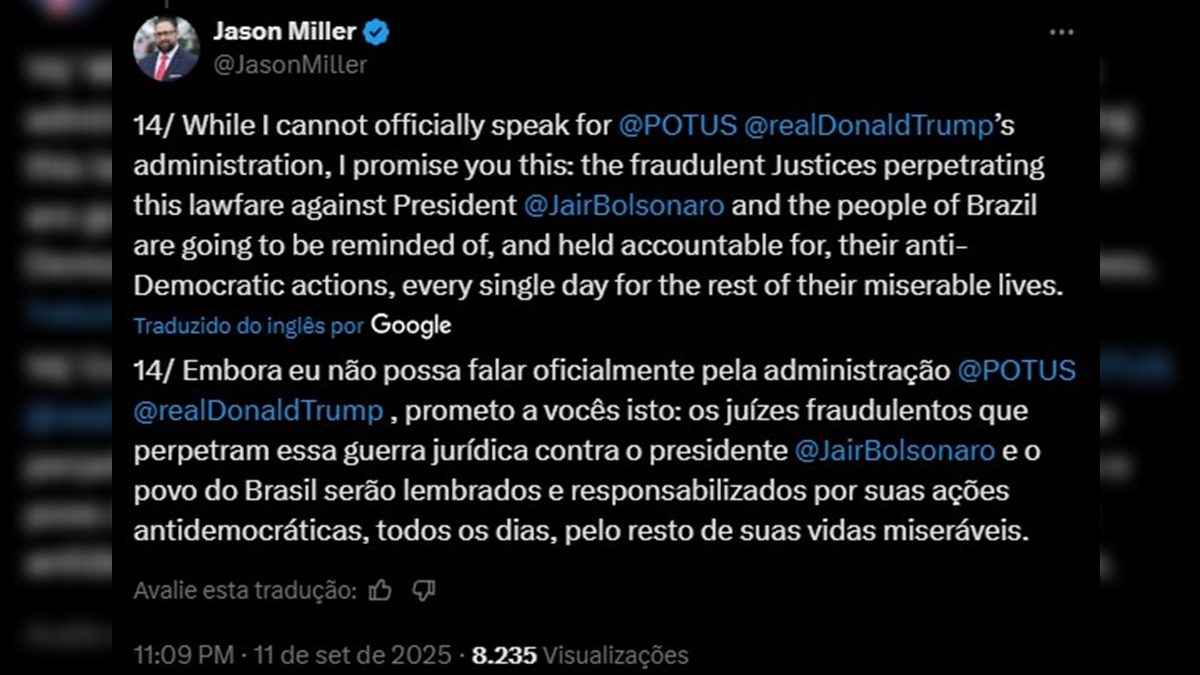 “Embora eu não possa falar oficialmente pela administração @POTUS @realDonaldTrump, prometo a vocês isto: os juízes fraudulentos que perpetram essa guerra jurídica contra o presidente @JairBolsonaro e o povo do Brasil serão lembrados e responsabilizados por suas ações antidemocráticas, todos os dias, pelo resto de suas vidas miseráveis”, escreveu em uma postagem na rede social X. *Com informações do BNews