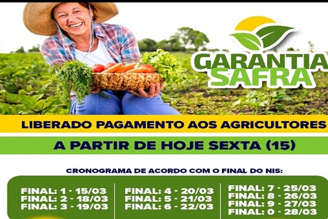 A Portaria Nº 127, que autoriza os pagamentos agricultores familiares que aderiram ao Garantia-Safra na safra 2022/2023 foi publicada nesta sexta-feira, 15 de março, no Diário Oficial da União. Cada agricultor apto receberá a partir desta sexta-feira, o benefício no valor de R$ 1.200 em parcela única. Podem receber o benefício Garantia-Safra agricultores familiares que possuam Declaração de Aptidão ao Pronaf (DAP) Ativa, que tenham renda familiar mensal de no máximo um e meio salário mínimo e que plante entre 0,6 a 5,0 hectares de feijão, milho, arroz, algodão ou mandioca.
