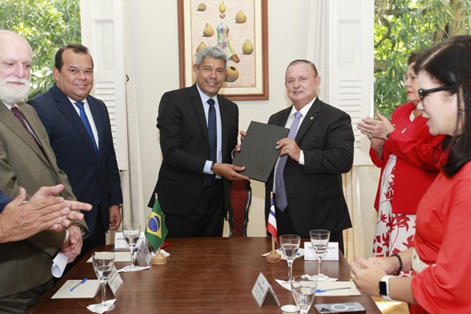 Uma entrega simbólica e inédita do projeto de Lei de Diretrizes Orçamentárias (LDO) foi realizada durante reunião na manhã desta segunda-feira (15), no Palácio de Ondina, entre o governador Jerônimo Rodrigues e líderes da Assembleia Legislativa da Bahia (Alba), do Tribunal de Justiça, do Tribunal de Contas do Estado, do Ministério Público e da Defensoria Pública do Estado. O encontro marca um momento de alinhamento entre os poderes para que os repasses orçamentários do próximo ano sejam feitos com base nas suas necessidades reais, evitando ajustes nos repasses ao longo do ano. Jerônimo Rodrigues destaca que essa é a primeira vez que o projeto é entregue ao presidente da Assembleia Legislativa pelo próprio governador. “Fizemos um pacto de uma agenda permanente, acompanhando a execução orçamentária, respeitando a autonomia dos poderes e dos órgãos de controle.