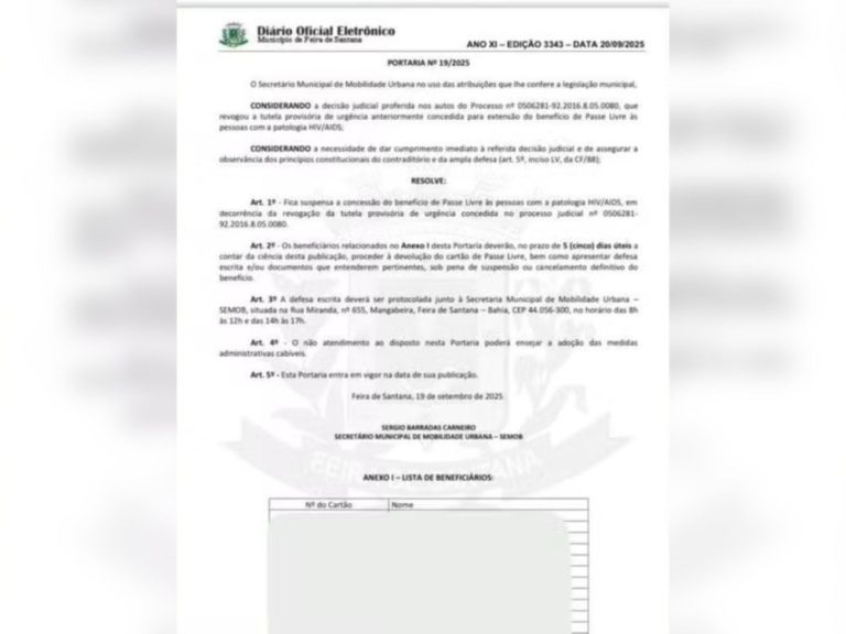 A Prefeitura de Feira de Santana publicou por engano, no Diário Oficial, a lista com nomes de mais de 600 pessoas vivendo com HIV, além de pacientes com fibromialgia e anemia falciforme, ao suspender o benefício do passe livre no transporte urbano. O documento foi retirado do ar horas depois.