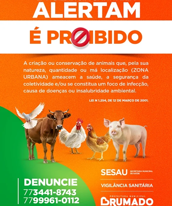 A Prefeitura Municipal de Brumado, por meio da Secretaria Municipal de Saúde (SESAU) e da Vigilância Sanitária, reforça um importante alerta à população: é proibida a criação ou conservação de animais em áreas urbanas, quando essa prática representa risco à saúde pública, à segurança da coletividade ou se configura como foco de infecção e insalubridade ambiental.