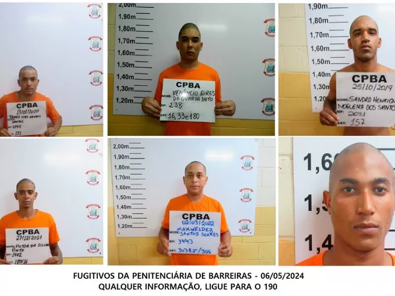Seis homens fugiram do Conjunto Penal de Barreira, no Extremo Oeste da Bahia. Os detentos conseguiram sair da unidade durante a madrugada e a fuga foi percebida na manhã desta segunda-feira (6). Conforme informações, três dos fugitivos respondem pelo crime de homicídio, dois por roubo e um por receptação.