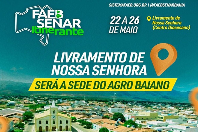Entre os dias 22 e 26 de maio, Livramento de Nossa Senhora se tornará a cidade-sede do agro baiano, ao receber a primeira edição do Sistema Faeb/Senar Itinerante, que levará atendimento gratuito à população de toda região. A programação inclui cursos; palestras; seminários; dias de campo focados nas cadeias produtivas regional, a exemplo da bovinocultura leiteira, plantio intensivo da palma e manejo e produção eficiente de maga e maracujá; além do atendimento gratuito sobre temas ambientais, jurídicos, previdenciários, dentre outros. “O Sistema Faeb/Senar Itinerante é um evento completo, que vai atender não só o público rural, mas toda a população de Livramento de Nossa Senhora e dos municípios vizinhos, levando ações de saúde, educação, promoção social e assistência técnica e gerencial para homens e mulheres do campo”, pontuou o presidente do Sistema Faeb/Senar, Humberto Miranda.